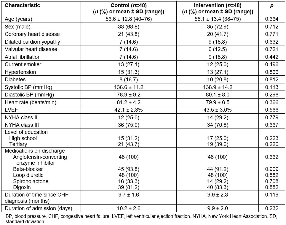 There was no significant (p>0.05) difference in age, sex, baseline cardiac conditions, and left ventricular function between the intervention and control groups on admission (Table 2). More than 70% of the participants were men, and CHD was the primary cause of CHF in approximately 42% of the patients in the intervention and control groups. The use of major cardiovascular drugs was also similar between the two groups at the time of discharge (Table 2). All the control and intervention group participants completed the follow-up studies 12 months after the initial discharge.