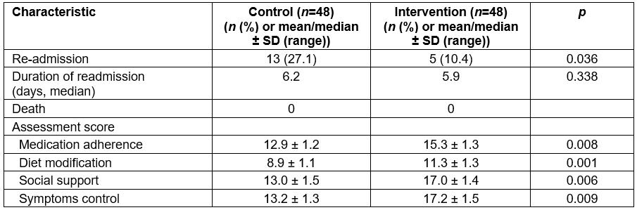 All patients survived to the end of the 12-month follow-up. Five of the intervention group and 13 of the control group participants were admitted during the study period due to deterioration of CHF (p=0.036, Table 3). All were single readmissions. There was no statistically significant difference in the duration of the readmissions (p>0.05).