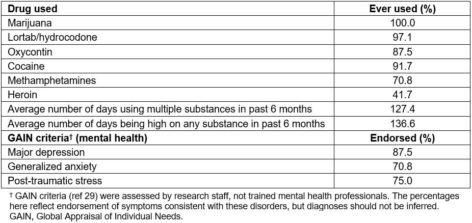 Table 2: Drug use and mental health in sample (n=24)