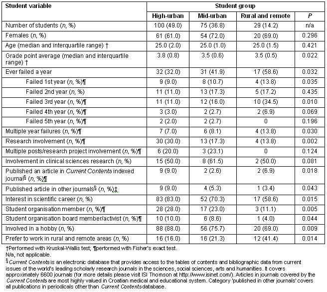 A shortcoming of the present study is the use of self-reported data, and possibly recall-biased survey data. Due to the lack of strict definitions of rurality, some group miss-classification may have occurred. To overcome this problem, we divided students into three groups, gradually increasing the urbanisation level. Additionally, the results reported here may vary yearly. A continuation of the survey in forthcoming cohorts might confirm the finding of the unfavourable effect of rural and remote background on students' academic and research performance at Zagreb University Medical School.