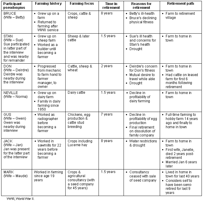 The seven study participants (aged from their late 50s to late 60s, and thus all 'relatively young, older men') had engaged in agricultural work as their primary paid occupation. Six of the seven had resided on the land where they worked prior to their retirement, while one worked on the land but lived in a country town. All participants were married and living with their spouse at the time of the study. Most participants had a family history of farming and, on retirement from full-time farming, had moved 'into town' with their spouse. Others, however, moved more gradually into semi-retirement, scaling down the farm size before finally moving into a home in town. Participants had been involved in varying agricultural pursuits (Table 1).