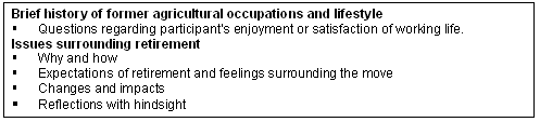 To be included in the study, participants were required to have retired and terminated their association with the land - typically through sale of their farm. For most, this meant moving to live in a township. Furthermore, they were to have been retired between 2 and 10 years. The 2 year lower limit was established drawing on evidence that, for retired men, morale is significantly higher in the first 2 years of retirement, after which time morale may diminish with the passing of the first 'flush' of retirement24. It had also been found that higher activity levels and feelings of internal control, which are present in retirees after one year in retirement, may decline after 6-7 years25. The 10 year upper limit was set to ensure sufficient recall of experiences of the transition from living on the land: the highs and lows of settling into retirement. However, after the study had commenced, it became apparent that three participants had been fully retired from farming activities for only 18 months.