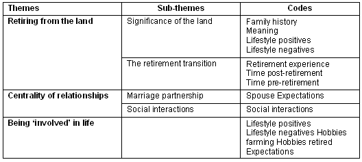 In the interviews, participants discussed how they began in their farming careers, the difficulties they encountered along the way (with finances, drought and livestock), and their observations of changes within the agricultural sector. Some of these data have been included in the Results and Discussion section in order to convey elements of the farming context from which participants retired and the meanings associated with this. However, as the focus of this study is on retirement and coping with the transition to retirement, the three themes presented in this article address participants' experiences of retirement. These include the meaning and significance of the land they farmed, and the associated challenges in adjusting to retired life; the significance of spouses, families and social contacts to the retirement experience; and the role of hobbies or interests other than farming in making the transition.