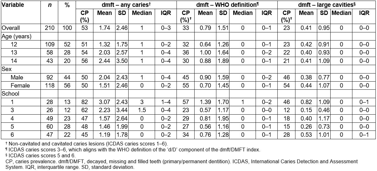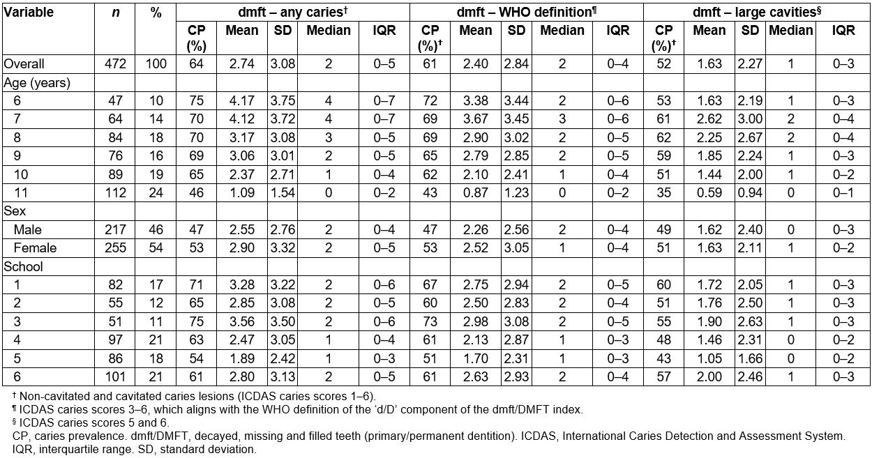 In the primary dentition of children the overall prevalence of caries (any caries lesions) was 64%, the mean dmft score (any caries lesions) was 2.74 (SD 3.08) and the median dmft score was 2 (IQR 0–5) (Table 1); for the WHO index age of 6 years, caries prevalence was 75% and the mean dmft score was 4.17 (SD 3.75) and the median dmft score was 4 (IQR 0–7) (Table 1). Variations in caries prevalence and experience scores were observed across the six schools.