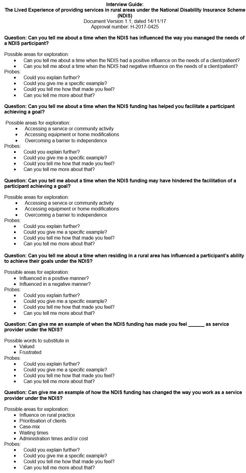 Data were collected from May 2018 to September 2018, 22–26 months after the official rollout of the NDIS in these areas. Individual semi-structured interviews were conducted with each participant. One researcher (RD) conducted all interviews and the majority of the data analysis. Participants were asked about their experiences providing services for clients of the NDIS. The interview guide (Appendix I) was developed by members of the research team who had experience in providing health services within the NDIS and experience undertaking qualitative research. These questions were trialled at two pilot interviews with NDIS allied health providers and were refined based on feedback received. Demographic information was collected with each participant at the commencement of each interview to provide context for their experiences. Interviews were conducted face to face or by telephone, and were audio-recorded and transcribed verbatim. Transcripts were then analysed thematically.