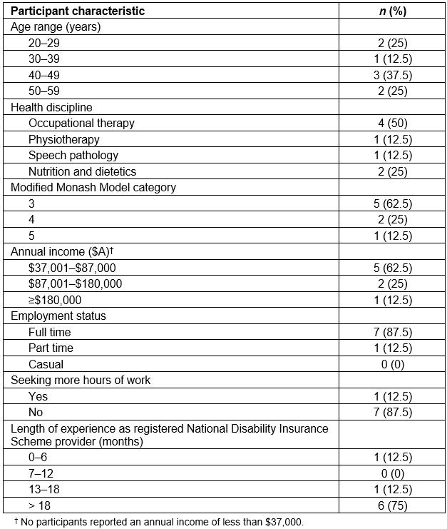 Eight service providers, representing four allied health disciplines from a range of rural and remote locations, were interviewed. Demographic data is presented in Table 1. Participants reported residing and working in a range of rural and remote areas of NSW. Although no participant identified as providing services in areas categorised as MMM category 6 or 7, these areas are considered remote or very remote communities and are predominantly serviced by outreach multidisciplinary teams15,17. All participants were female and had bachelor-level qualifications in their respective health disciplines. No participants reported masters- or doctorate-level qualifications. No participants identified as Aboriginal and/or Torres Strait Islander.