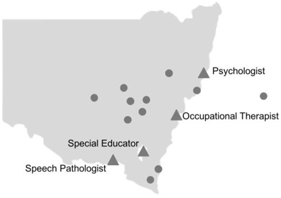 A multidisciplinary team including a speech pathologist, occupational therapist, psychologist and a special educator were recruited via an expression of interest from the project lead within an autism-specific, not-for-profit organisation. All successful therapists had a minimum of 2 years experience in delivering autism support, and no prior experience in delivering autism support via tele-therapy. Tele-therapists were trained by the project lead via group webinar and individual online consultation to deliver tele-therapy services. Child participants were recruited via an expression of interest email sent to the service waitlist of the not-for-profit organisation. Parents gave written consent for themselves and their child(ren) to participate. A total of 16 children on the autism spectrum (median age 8 years, range 2–12 years) and their families participated in the program. Participants and their families resided in 13 separate regional communities across northern, western and southern New South Wales (NSW). Local support teams including educators and allied health staff were recruited via an information statement emailed to them by children’s parents. Consent forms were returned to the project lead. Local support team members (educators and allied health professionals) were recruited in all three regional areas of NSW. Figure 1 shows the geographical spread of tele-therapists and participants in NSW.