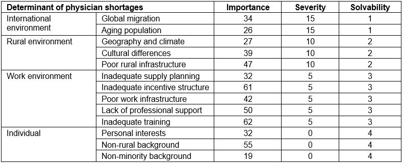 Table 2: Prioritization of the determinants of physician shortages in rural regions