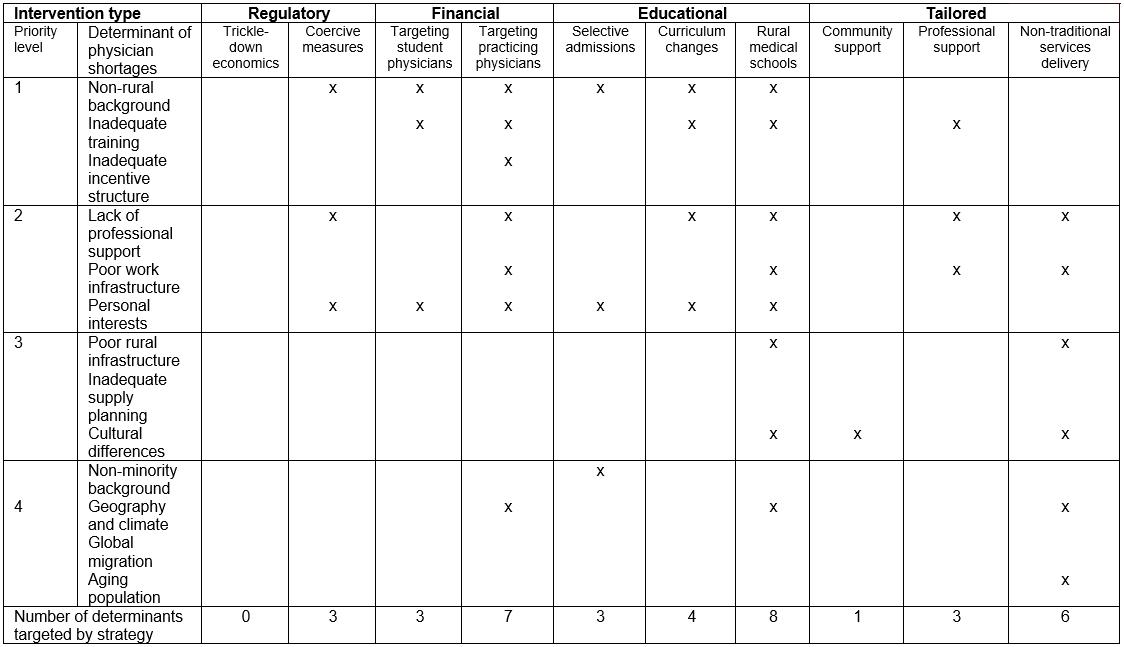 Finally, the interventions designed to address the shortages of physicians in rural regions of OECD countries were analyzed based on their ability to target the priority determinants. This is displayed in Table 3.