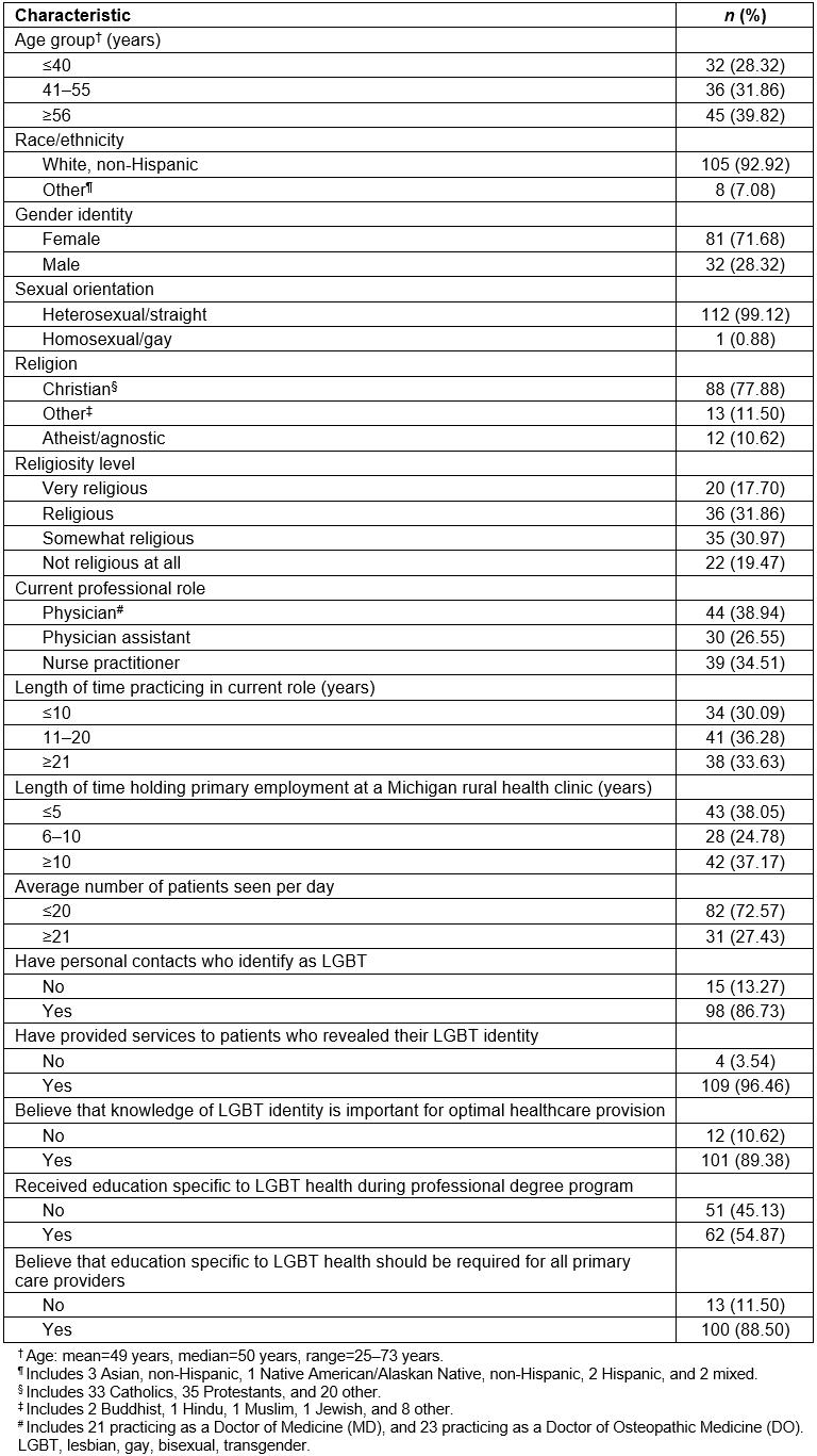 Descriptive characteristics of the 113 participants are presented in Table 1. Age range was 25 to 73 years (mean=49 years), and the majority were non-Hispanic white (92.92%). Eighty-one (71.68%) were female, 32 (28.32%) were male, and none were genderqueer or non-binary, or any other gender identity. Only one participant (0.88%) identified as homosexual/gay, and none identified as bisexual, queer, or any other sexual orientation. More than three-quarters (77.88%) identified with a Christian faith, and most participants indicated being somewhat religious (30.97%), religious (31.86%), or very religious (17.70%). Twenty-one (18.58%) were currently practicing as an MD, 23 (20.35%) as a DO, 30 (26.55%) as a PA, and 39 (34.51%) as an NP. More than three-fifths (61.95%) reported holding primary employment at a Michigan rural health clinic for 6 or more years.