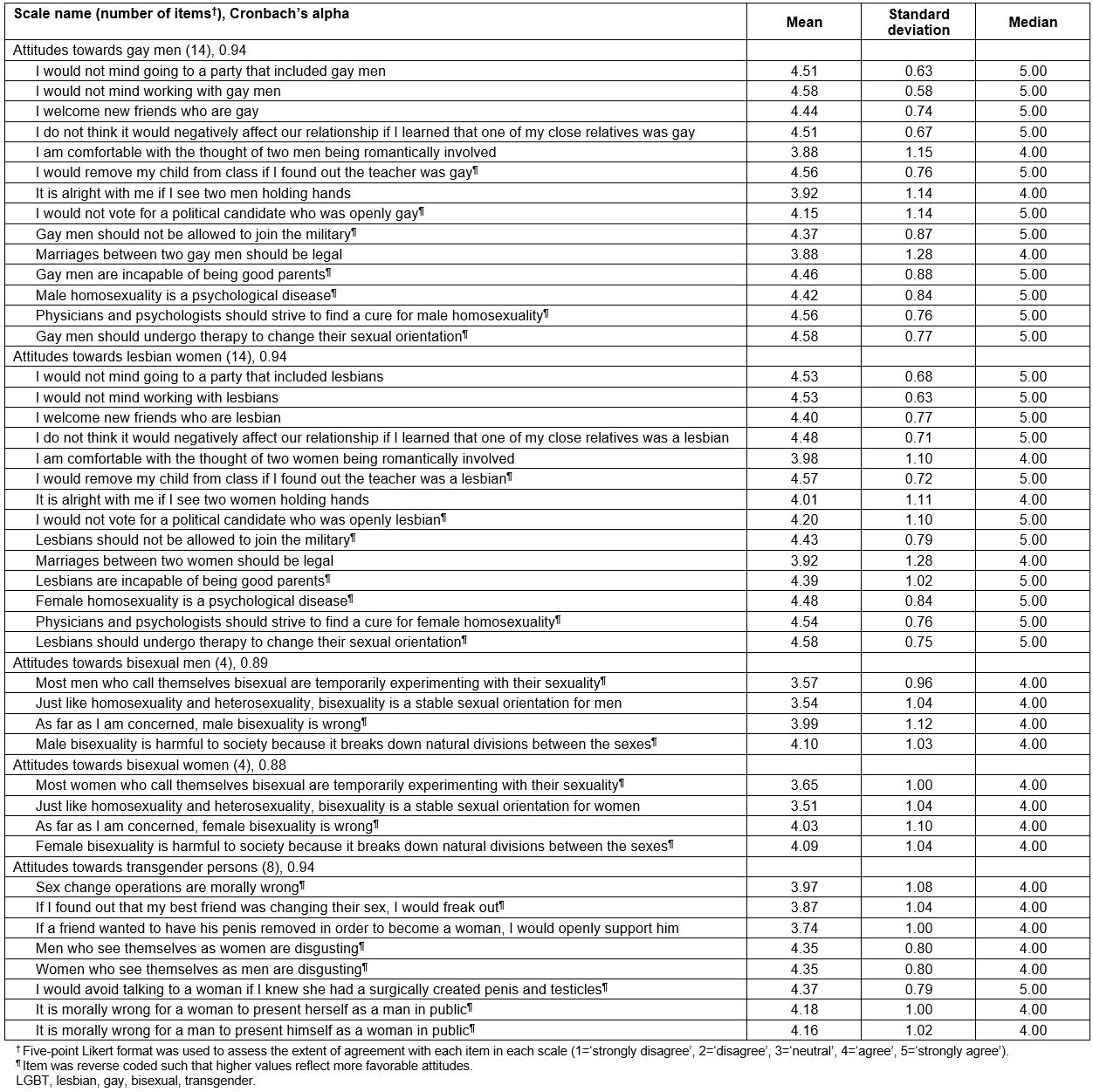 Table 2: Items comprising scales to assess attitudes of 113 rural primary care providers towards distinct LGBT subpopulations, Michigan, USA, May to July 2017