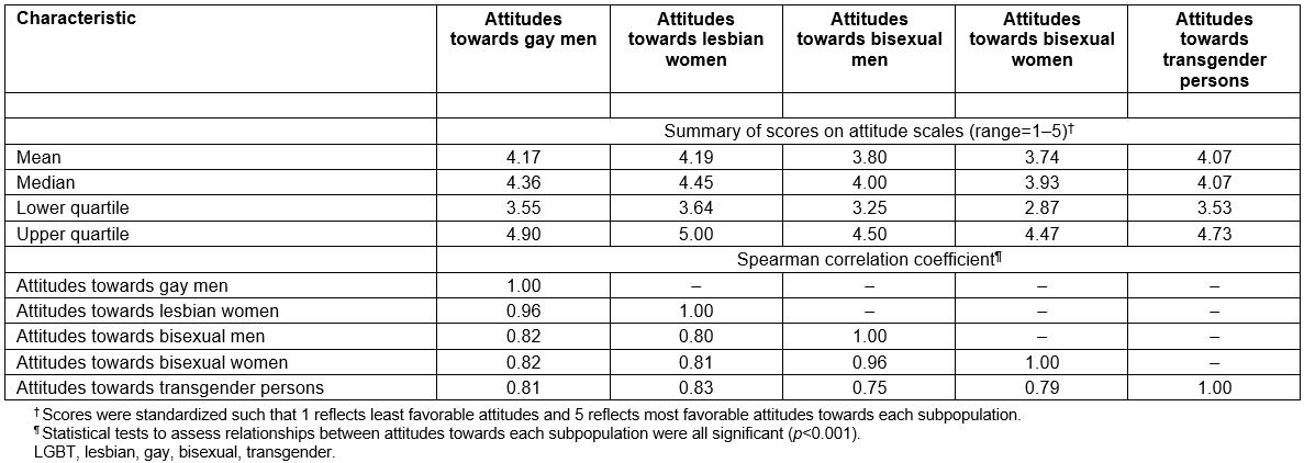 Table 3: Overall attitudes of 113 rural primary care providers towards distinct LGBT subpopulations, and their correlations, Michigan, USA, May to July 2017