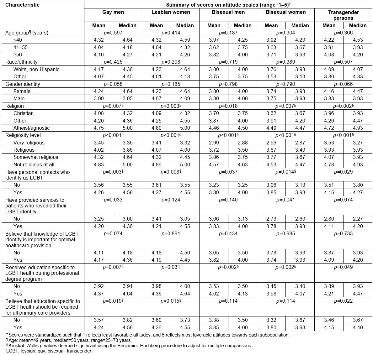 On adjusting for multiple comparisons, Kruskal–Wallis tests indicated significant differences in attitudes towards gay men across strata of religion and religiosity level, with relatively low scores noted for those identifying with a Christian faith, and progressively decreasing scores noted with increasing levels of religiosity. Participants who did not have personal contacts who identify as LGBT also had significantly less favorable attitudes towards gay men. However, those who had received education specific to LGBT health during their professional degree program, and those who believed that such education should be required for all primary care providers, had significantly more favorable attitudes. Multivariable linear regression modeling identified associations with religiosity level (p<0.001), having received education specific to LGBT health (p=0.044), and believing that such education should be required (p=0.003).