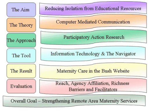 There are three factors thought to affect the utility of navigators6. These are: 'reach', the number of people sharing the information; 'agency affiliation', meeting the needs of the target audience; and 'richness', delivering quality, reliable information6. Where agency affiliation and richness are focused on a particular field then reach does not have to be broad, but does need to be specific. These factors were used to develop and evaluate a process that enabled remote practitioners in the NT to access targeted information on maternity care. The researchers believed that a navigator could guide remote-area maternity service providers to a resource library specifically targeting their educational needs.