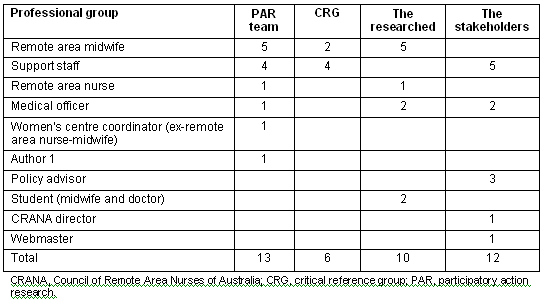 Table 1 shows the professional groups who participated in the research, using Wadsworth's four conceptual parties (a PAR team, a critical reference group [CRG], a group called the 'researched', and the 'stakeholders' group) as a framework for describing participation14.