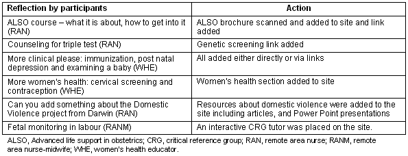The cyclical PAR approach ensured the research group influenced the composition of the resource library increasing agency affiliation as the project progressed. An example of feedback around agency affiliation included the following email: 'Some of the remote workers have said they would like clinical information - updates on new drugs for preterm labour etc' (WHE, 05.03). In response, two clinical sections were placed on the site, one for antenatal care and one for birth and postnatal care, with a focus on the issues that are particularly pertinent in remote Australia (eg preterm labour). Table 2 is an example of how agency affiliation worked.