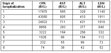 The abnormal laboratory findings are produced by injury to skeletal muscles. That results in the leakage of intracellular contents from myocytes into the plasma (rhabdomyolysis). Thus, an elevation of serum CPK, AST, ALT, LDH and serum aldolase is noted; these improve progressively during the following days. Myoglobinaemia is also present. Urine analysis reveals the presence of myoglobine or/and evidence of myoglobinuric renal failure21. Myoglobinuria resolves within hours, while the other findings resolve within 2-10 days.