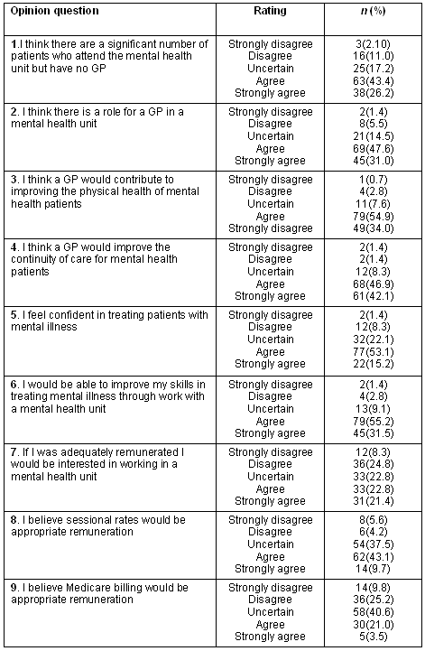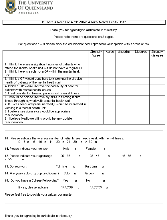The questionnaire was designed to gather the opinions of the rural and remote GPs regarding the need for a GP within a rural mental health unit. The first nine questions used a 5 point Likert scale (strongly disagree = -2, disagree = -1, uncertain = 0, agree = 1, and strongly agree = 2) to ascertain opinions about each of the following: