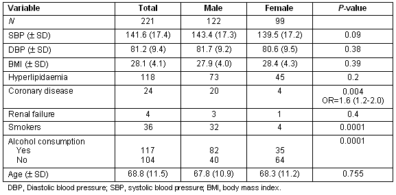 The mean age ± SD of the sample was 68.8 ± 11.5 years and there was no statistically significant difference between men and women (67.8 ± 10.9 vs 68.3 ± 11.2, p = 0,7). The mean duration of diabetes ± SD was 12.4 ± 6.7 years. The mean ± SD value of BP was 141.6 ± 17.4 mmHg and 81.2 ± 9.4 mmHg for systolic and diastolic BP, respectively. Systolic and diastolic BP was higher in men than in women (Table 1). The overall prevalence of hypertension was 194/221 (87.7%). No significant differences were found in prevalence rates among men and women.