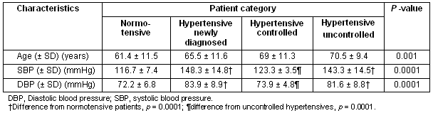 In total, 34.1% (66/194) of hypertensive patients were not aware of having hypertension. Of those who were aware (n = 128, 65.9%), all were treated. Among treated hypertensives, only 11 persons (11/194, 5.6%) had systolic BP <130 mmHg and diastolic BP <85 mmHg. Sixty-two (38.7%) had systolic BP <140 mmHg and diastolic BP <90 mmHg. Table 2 shows the characteristics of subgroups classified by treatment and control status.