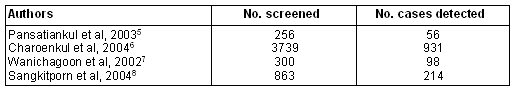 A summary of the usefulness of the program in rural Thai communities is provided. A search for recent reports concerning the use of OF and DCIP tests for antenatal clinic screening in rural communities was performed by literature search of PubMed and the Thai Index Medicus. Four reports were found (Table 1)5-8. In all, 5158 subjects were screened and 1299 cases (25.2%) of the disorder were detected. The high prevalence of the disorder confirms the importance of screening. The reported sensitivity and specificity of the combined tests are 100% and 97%, respectively4.