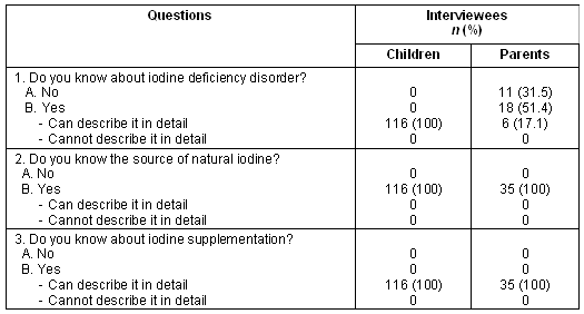 All 116 included primary school children lived in 35 houses in the village. A home visit and parental interview was achieved for all children. Considering the parents, only 24 of 35 reported that they knew of IDD, and only 18 parents could describe endemic goiter in detail (the others described it incorrectly as toxic goiter). All 18 parents correctly stated that the disorder was not contagious and that IDD patients would have an enlarged thyroid gland, which required specific treatment. However only four subjects knew that iodine was important in the intellectual development of children. Like their children, all parents knew and could describe in detail the natural source of iodine and significance of iodine supplementation. The major source of this knowledge was the mass media, especially radio (27 respondents, 77.1%) and television (8 respondents, 22.9%).