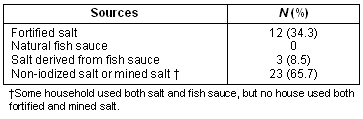 The kitchen survey revealed various sources of ingredients with a salty taste (Table 3). The most common was mined salt (65.7%), and only 34.3% of households had iodine supplementation (all from iodine-enriched salt). No iodized water was used for supplementation. Further enquiry revealed that iodized salt and iodized water were unpopular due to their unpleasant taste. In addition, natural fish sauce and salt-derived fish sauces were difficult to obtain and judged too expensive to use.