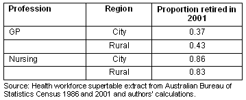 As the health workforce ages, patterns of attrition are important for understanding the workforce age structure. Attrition rates for the cohort of rural and city GPs and nurses aged 50-55 in 1986 and then aged 65-69 in 2001 were calculated. Most notable was that rural GPs in this age group retired significantly earlier than those in the city (p<0.001) (Table 2).