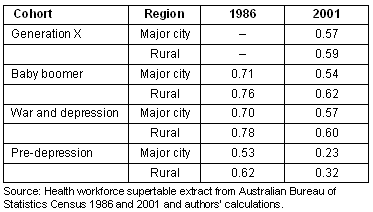 In 1986, a significantly higher proportion of all rural GP cohorts worked more than 41 hours per week than city GPs (p<0.05). However, by 2001 only the older baby boomer and the pre-depression cohorts worked significantly longer in rural areas than in the city. These younger rural generation X GPs were no more likely to work long hours than their city peers (Table 3).