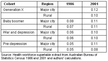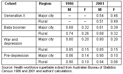In 1986 there were more male than female GPs in each cohort with rural GPs more likely to be male than those in the city (Table 5). With each successive cohort the proportion of women increased in both the city and rural areas. By 2001, the split between men and women was almost even for generation X, with rural Australia having a slightly higher proportion of women than the city. However, in the older cohorts, rural Australia still had a lower proportion of women than in the city.