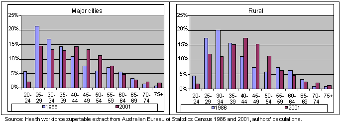 Twenty years ago rural GPs were younger than city GPs but that is no longer the case. Between 1986 and 2001 both the rural and city GP workforce aged with the rural GPs being significantly older than city GPS by 2001 (p<0.001) (Fig 1). During this period, the percentage of rural GPs aged over 40 years rose from 40% to 60%, compared with 43% to 57% for city GPs. In 2001, baby boomers made up 52% of the city GP workforce and 59% of the rural GP workforce.