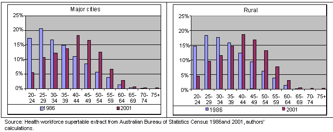 The rural nursing workforce is slightly but significantly older than that in the city (p<0.001). In 1986, 31% of city nurses were 40 or more years of age compared with 33% in the country. But by 2001 this proportion had increased to 58% for city nurses and 60% for the country (Fig 2).
