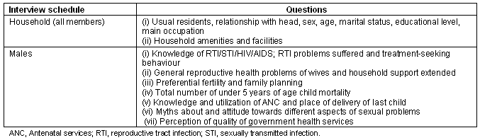 A door-to-door survey was undertaken during the year 2002-2003. The sampling was purposive and an attempt was made to interview 260 currently married Khairwar men in the age group 15-40 years in the Sidhi district of the state of Madhya Pradesh in two blocks: Kushmi and Waidhan. Care was taken to interview only one male from each household. The issues covered in the interview schedule were identified from the local areas by personal discussion and group discussions with key respondents, usually village headman, local health workers, village teacher etc. Once the schedule was designed it was pre-tested in the field with a small sample of tribal men. The schedule was also checked by the National Institute of Medical Statistics (ICMR), New Delhi. The broad aspects covered in the interview schedule are summarized (Table 2).
