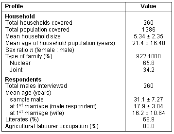 A total of 260 men agreed to be interviewed (52% response rate). The demographic characteristics of the interviewed sample are shown (Table 3). The Khairwar population is a young population with a sex ratio in favour of males. Approximately 69% of the males were found to be literate. Among the literates, most had studied up to class VIII standard.
