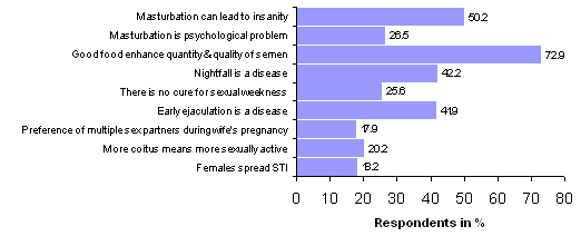 Myths and attitudes towards sexual problem: Myths about masturbation, nightfall and unhelpful attitudes towards various sexual health matters were expressed by a number of respondents and are presented (Fig 3). About 18% of males believe that the women is responsible for the spread of reproductive health problems, and 18% prefer multiple sex partners during their wives' pregnancy. Such male attitudes towards sexual matters only lowers the esteem of women, further decreasing their opportunity to exercise choice in sexual health matters.