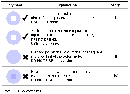 As is shown (Table 1), as the Vaccine Vial Monitor changes its color from stage I to stage IV as the result of increased temperature, the user is advised against using the vaccine. The Vaccine Vial Monitor is a crucial tool to monitor potential problems with potency of OPV in the field, especially in developing countries. Poor infrastructure and insufficient resources present a number of challenges maintaining the cold chain5.