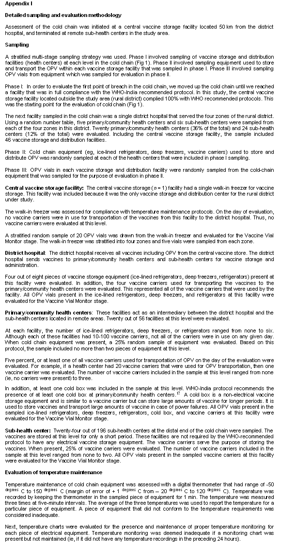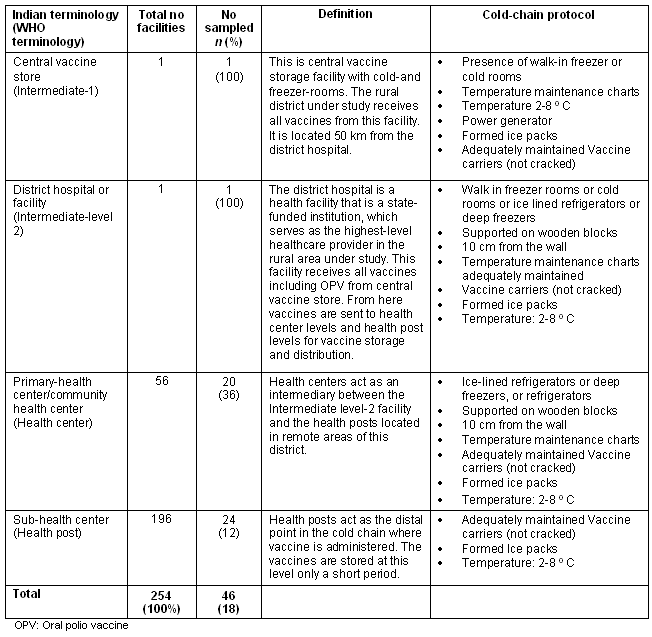 The cold chain evaluation was conducted in a rural district of central India which is served by one district hospital, 56 primary health centers/community health centers and 196 sub-health centers. Five compatible polio cases and 64 acute flaccid paralysis cases were reported in this district in 2004. All levels of health centers from central vaccine storage facility to the remote sub-health center were included for evaluation of the cold chain.