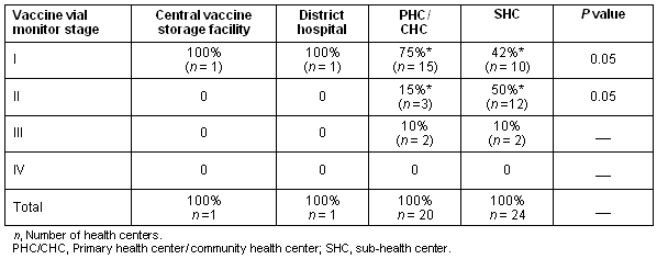 All vaccine vials present in the sampled cold chain equipment at a vaccine storage facility were inspected and the Vaccine Vial Monitor stage recorded. Each vaccine storage facility included in the sample was assigned a Vaccine Vial Monitor stage based on the single highest stage of Vaccine Vial Monitor found at that facility on a vial. For example, if at a primary health center A, 5 polio vaccine vials were included in the sample for evaluation of the Vaccine Vial Monitor stage, and if the highest Vaccine Vial Monitor stage observed among these 5 vials was stage II, then this primary health center A was assigned a Vaccine Vial Monitor of stage II, even if the other 4 vials read stage I.