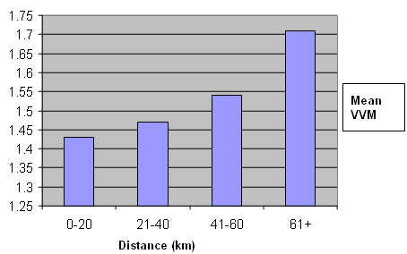 Figure 2: Relationship between the distance the vaccine traveled from the district hospital in kilometers and Vaccine Vial Monitor stage (VVM).