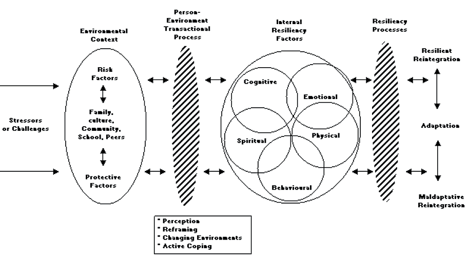Kumpfer developed a resilience framework (Fig1) in an attempt to incorporate the multiple factors influential in the development of resilience13. Within this framework, six major constructs were specified of which four are domains of influence and two are transactional points between two domains. The four domains of influence include the acute stressor or challenge, the external environmental context, the internal self characteristics and the outcome. The two points for transactional processes include the confluence between the environment and the individual, and the individual and the choice of outcomes. Kumpfer provided a comprehensive review of the research that supports his framework of factors and processes that contribute to resilience13.