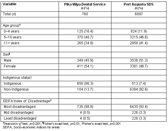 Our findings have highlighted the different characteristics of children attending for dental care between two services located in the same postcode area: Pika Wiya Health Service Oral Health Program and Port Augusta School Dental Clinic. The higher levels of disease experience, untreated disease and social disadvantage of children attending Pika Wiya provides further evidence for the need to address the health inequalities of Indigenous children living in the mid-north region of South Australia. While the Pika Wiya Oral Health Program is attempting to address some of these needs, a much broader focus to address the social and health inequalities will be required to improve the oral health characteristics of this population.