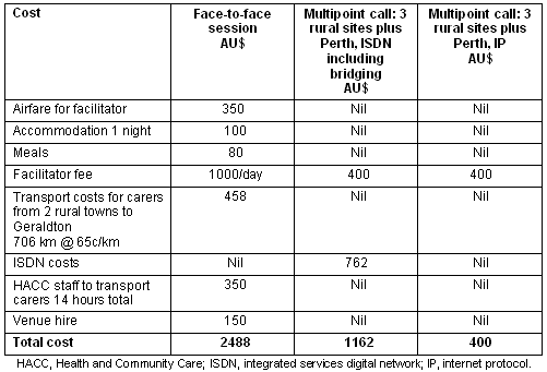 The videoconferenced sessions compared favorably to the costs of face-to-face sessions, which are typically held in the regional centre. Table 1 contrasts three scenarios. The first is a face-to-face session in which the facilitator is flown to the regional centre, and carers from two outlying towns are transported into the centre. The second and third scenarios are videoconferenced sessions to three rural sites with the facilitator in the capital city. These scenarios are only 16 to 47% of the cost of offering face-to-face sessions to the groups with the same facilitator. The difference between scenarios two and three is whether videoconferencing over IP is available. There is no charge per session for the use of videoconferencing over the internet, whereas videoconferencing over ISDN entails telephone charges.