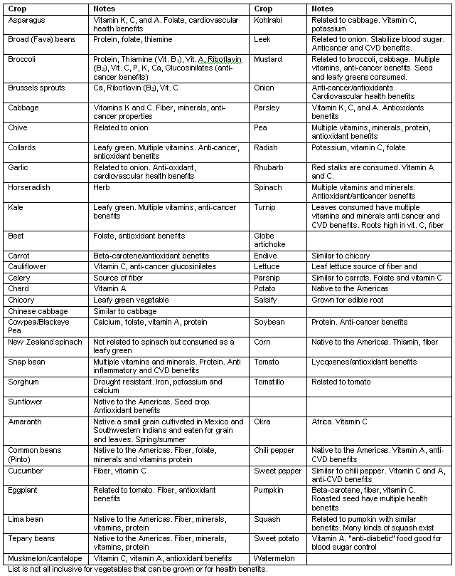 Some vegetable crops and their contribution to the diet, categorized according to season appropriate for a Navajo Gardens for Health45,58,59