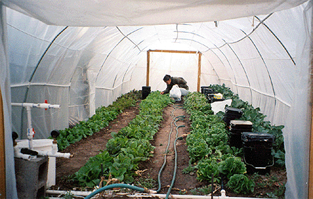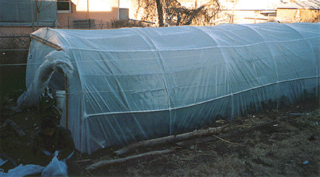 Another agronomic barrier on the Navajo nation is frost protection during winter months which prevents year-round production of vegetable crops. Fruit trees adapted to the area are dormant during this period and out of production until spring; however, cold weather limitations for vegetable crops may be partly overcome by selecting cool-season crops tolerant of light freezes such as lettuce and members of the Brassicaceae family including broccoli, kale, and cauliflower (Appendix II,III). Other adaptations to extend the growing season of the garden into the cold season are passively heated, low-technology greenhouses or row covers that permit cultivation of a wider variety of crops out of season (Figs 5-7). Low technology greenhouses have been described for both commercial and home applications53 and designs vary as does expense54-56. Most designs utilize the basic 'hoop construction' over which UV resistant plastic is laid and secured. Unlike traditional hobby or commercial greenhouses that use natural gas, coal or electricity to provide supplemental heat during cold periods (which is cost prohibitive), heat is captured in thermal mass within the greenhouse (using black plastic mulching, water bottles painted black, or brick masonry walls among others) and released slowly at night. When outside temperatures are slightly below freezing (32°F or 0°C) inside temperatures remain slightly above freezing depending on the amount of thermal mass present within the greenhouse. Other modifications include a second layer of plastic or spun-fiber row covering placed over crops within the greenhouse to boost insulation in below freezing weather57. The 'doors' are rolled up during the day when outside temperatures are above 60°F (15°C) to vent excessive heat and closed in the late afternoon to preserve heat. The total cost for a 4 x 9 m structure was less than US$200, which is affordable in the scheme of greenhouses but may be more suitable for community gardens with pooled monetary resources.