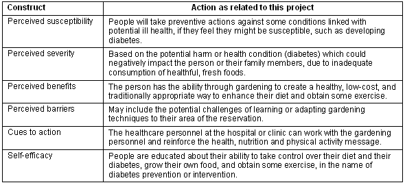 A Gardening for Health Project presented here is based on the Health Belief Model46,47. The six constructs of the Health Belief Model, as they relate to designing a diabetes prevention and care project are identified in Table 1. Even brief individual counseling sessions of 15 min on the health benefits of fruits and vegetables can induce increased sustained consumption48. The same approach of advice given to participants by garden staff on topics such as crop selection, horticultural techniques, harvest information and explained in lay terms can sustain the garden.