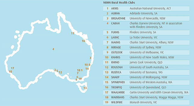 The NRHN enables communication and organisation of events at different universities and provides external representation on a national level. The cross-disciplinary and inter-university nature of the NRHN and its member clubs enables cooperation with many national rural health bodies and communication of issues, ideas and initiatives across a large portion of Australia's potential future rural health workforce. This is an approach applicable both to Australia and other countries. The present article discusses the activities and role of the NRHN and RHC as they pertain to encouraging future rural practice among pre-graduation medical and health science students. It was prepared on behalf of the NRHN after considering contributions from all Australian RHC.
