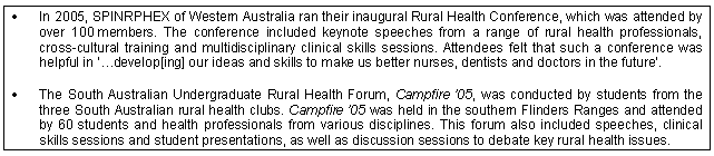 In the absence of formally funded national events in 2005 and 2006, several RHC held state-based rural health forums (Fig 2) in order to generate and foster enthusiasm for rural health issues, and to enable provision of opportunities for education and professional development of their members9. It is the opinion of the NRHN that this level of exposure is crucial for nurturing the future leaders in rural health care.