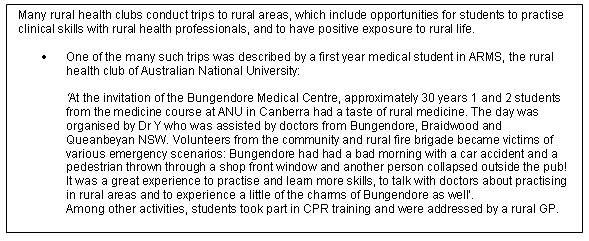 Positive rural experiences: The provision of affirming experiences is a rational concept in addressing the shortage of Australian rural health professionals. It is a focus of university RHC and the NRHN. It is necessary to target future health professionals early to encourage an informed and positive perspective on future rural practice. Rural health clubs aim to do this as well as to equip students as they graduate to become health practitioners.