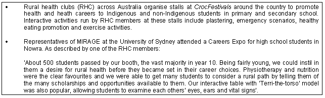 University RHC conduct numerous and diverse activities, including trips to rural locations, information and scholarship sessions, practical workshops, discussion forums, health promotion activities and social events2. For those clubs with a combination of nursing, allied health and medical membership, these activities are often cross-disciplinary in nature. Collaborative activities with university departments of rural health, Divisions of General Practice, medical rural clinical schools (RCS), Aboriginal medical services, community organisations and rural health professionals are also undertaken.