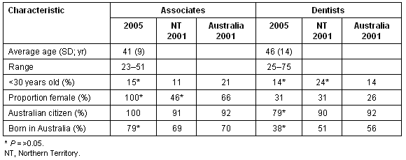 Compared with the rest of the country, a higher proportion of the associates in the NT were women at the time of the 2001 census but the age structure, place of birth and citizenship resembled the national average. Dentists in the NT in 2001 were significantly younger than for the whole country, but the proportion who were female, born in Australia or were Australian citizens was no different to the proportions nationally.